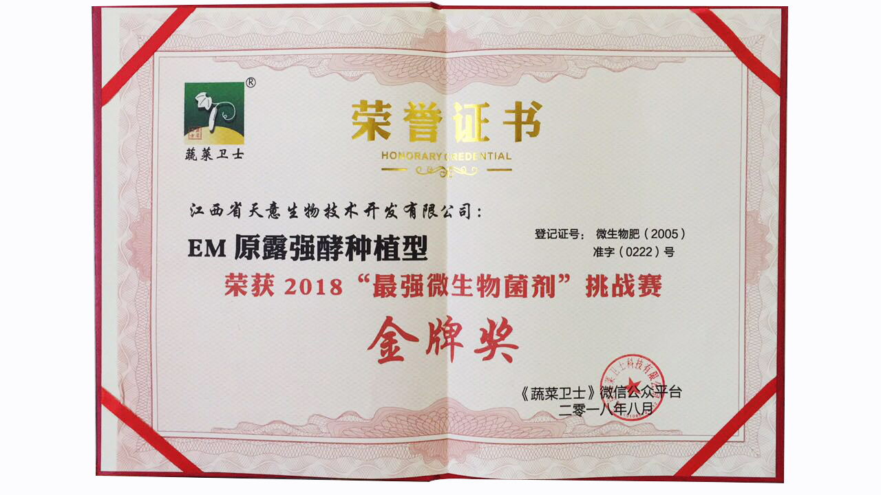 2000 2000年,天意企業獲得高新技術企業稱號,之后每隔三年直至今天均連續獲得國家高新技術企業稱號。同年,EM原露獲得省科技廳頒發的“優秀新產品”證書。