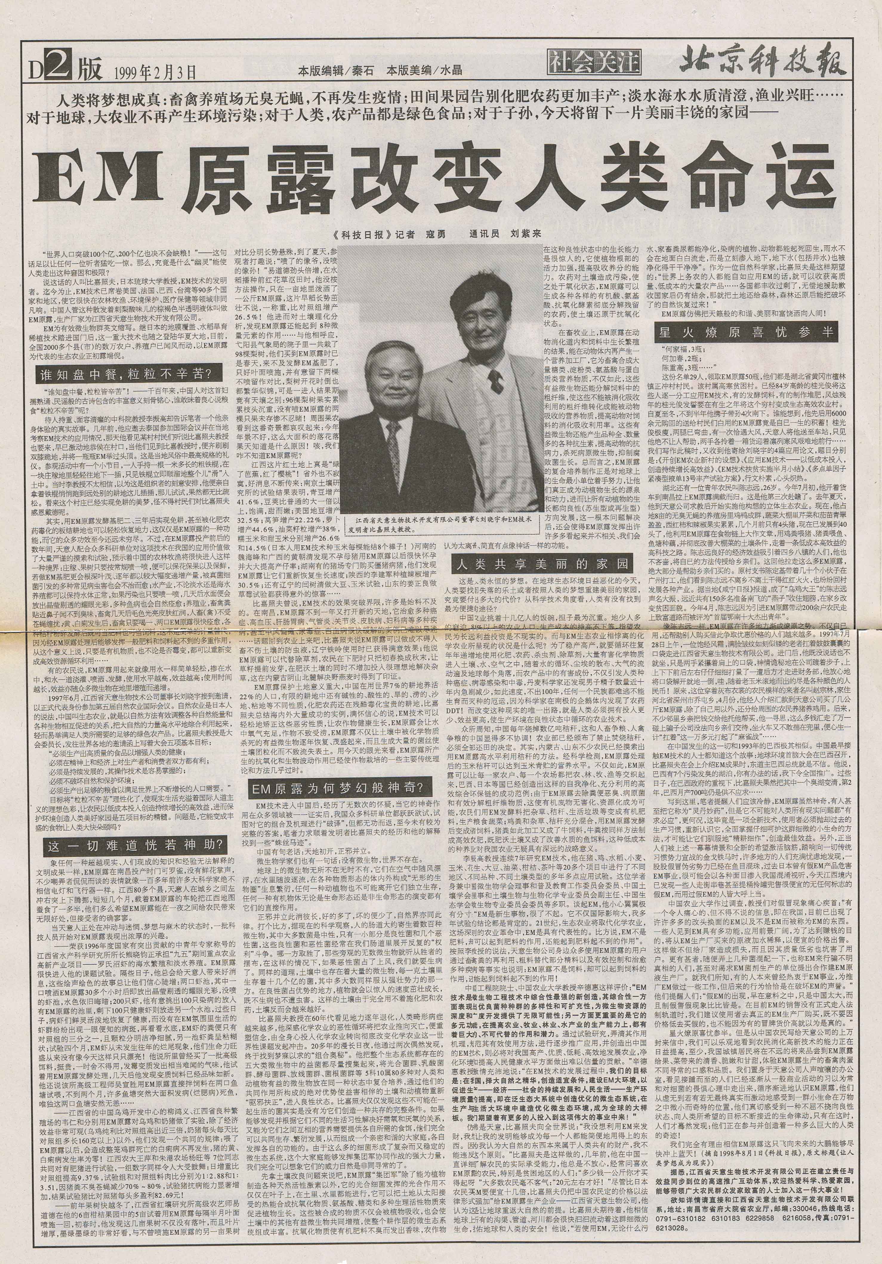 1999 1999年初,中央人民廣播電臺每天早晚對農村廣播的黃金時間開始播放全國各地農民使用EM原露的小故事,在該臺農村部撤消之前的六年時間里,每天播放農民們的自發來信在全國農村引起了廣泛反響。多地政府部門開始自主下文推廣EM原露。